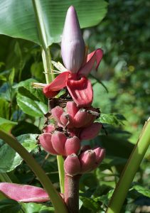 The edible, cold hardy, Pink Banana, Musa velutina. Photo by Green Deane